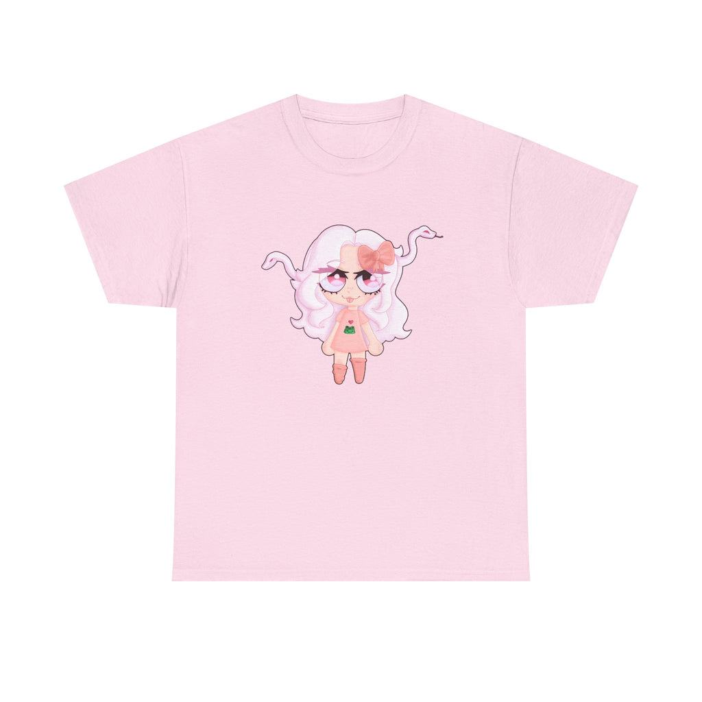 A soft, relaxed tee that brings a touch of playful pastel charm to everyday wear. The shirt features a sweet, dreamy character—fluffy pink hair, big lashes, and a tiny bow—that sits front-and-center like a pocket of whimsy. Lightweight yet sturdy cotton gives it a smooth feel and holds the printed details crisp and clear, so the design stays bright wash after wash. Wear it alone on warm days or layered under oversized sweaters; it blends into casual days at home, quirky meetups with friends, or low-key con events where cute, character-driven style speaks louder than trends. The look feels both nostalgic and modern—an easy way to show a soft, expressive side without trying too hard.