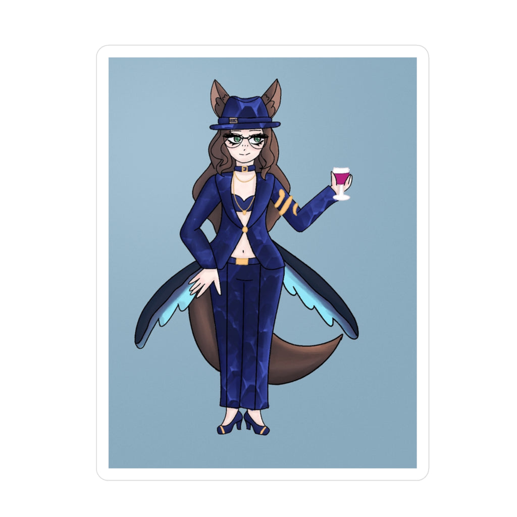 A kiss-cut vinyl decal featuring a stylish fox character in a snakeskin patterned navy suit and hat, holding a glass of wine. The satin-finish white vinyl brings out deep blues and crisp linework while the 1/8" white kiss-cut border gives a clean, sticker-ready edge. These decals peel off cleanly without residue and resist water, scratches, and UV exposure for up to three years, so they stay vibrant on laptops, water bottles, windows, or sketchbooks. The character design adds a playful, slightly elegant vibe — a little wink of personality for anyone who loves character art, furry fandom pieces, or decorative accents that travel with you.