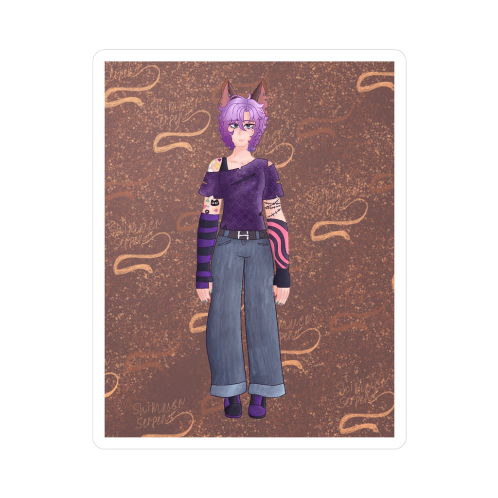 A kiss-cut vinyl decal that brings a quiet, quirky energy to your gear. This sticker features a purple-haired character with catlike ears against a warm, textured brown backdrop — soft satin sheen, vivid colors, and a tidy 1/8" white border that frames the art. It holds up to water, sun, and scratches for everyday wear on laptops, water bottles, phone cases, or windows. The removable adhesive peels away cleanly when you want to switch designs, while the durable vinyl keeps the print crisp for up to three years outdoors. Small, intentional imperfections in very light colors add a tactile, handcrafted feel that suits an indie, anime-adjacent aesthetic.