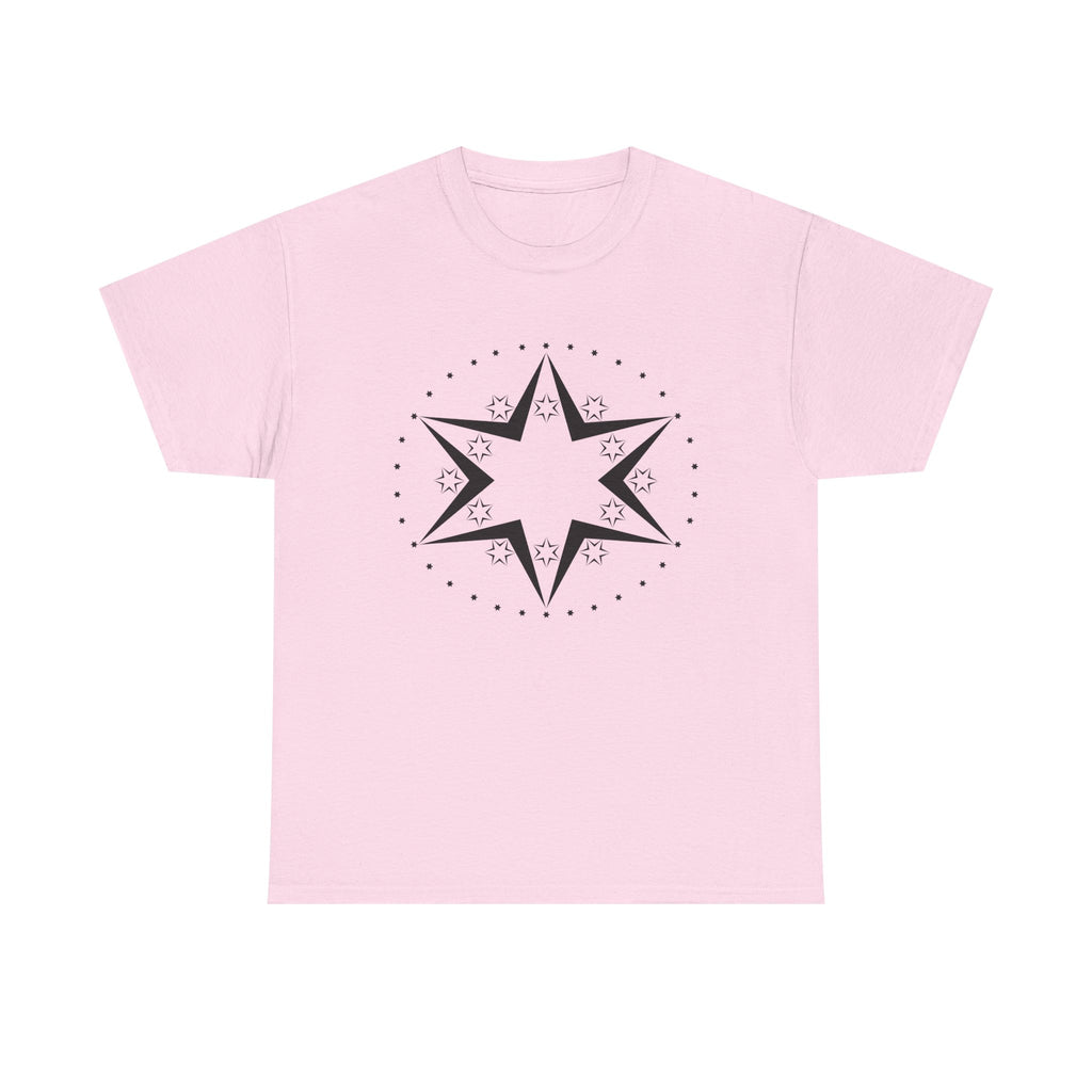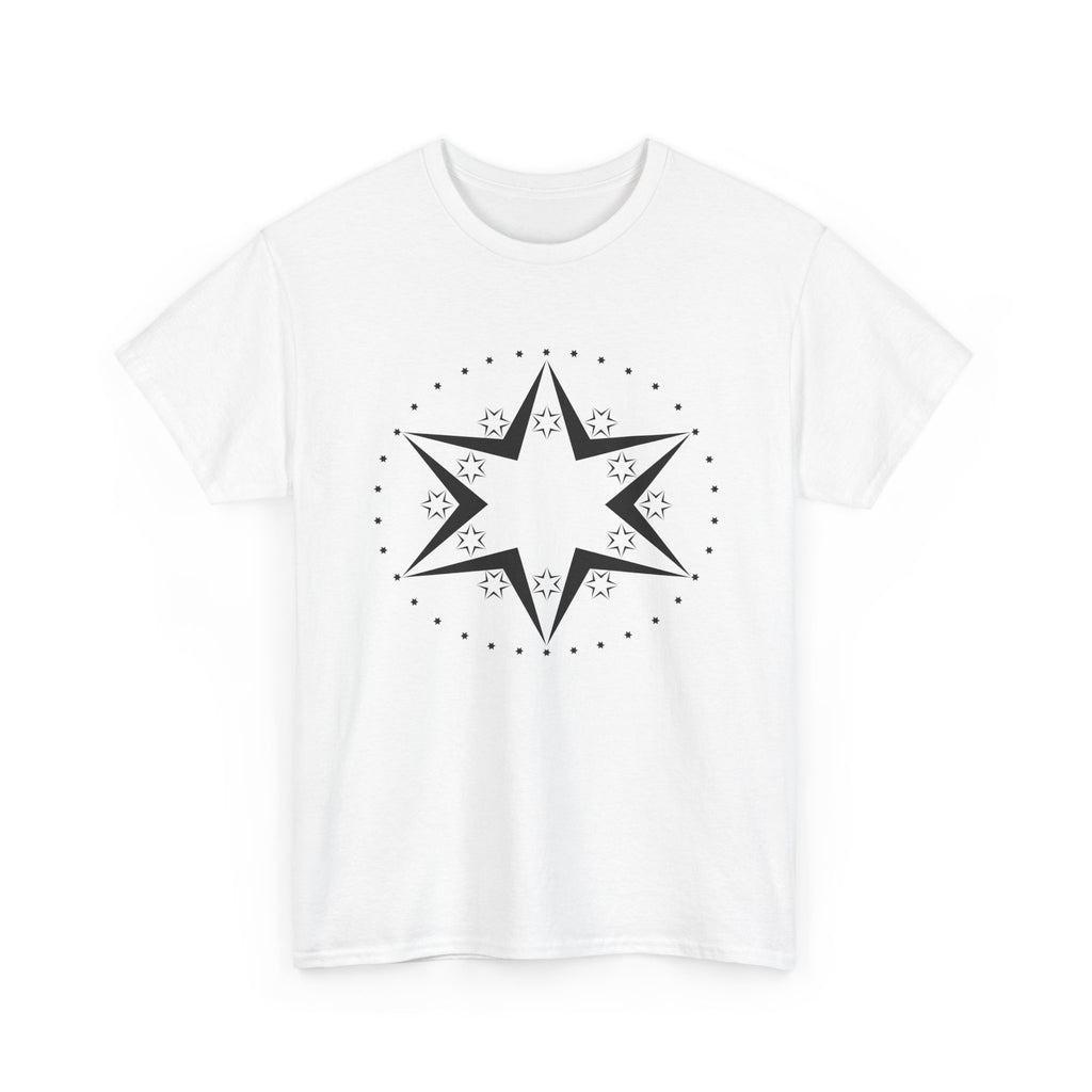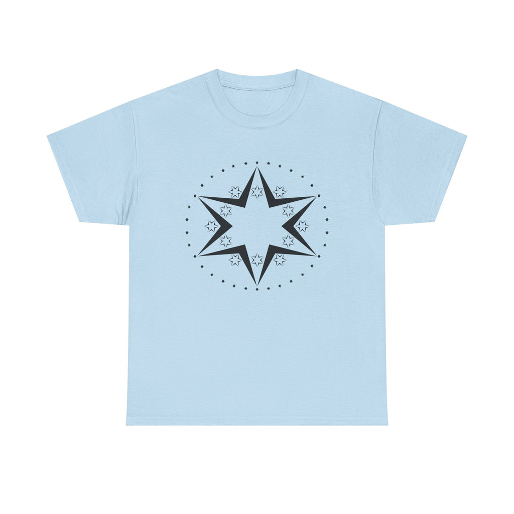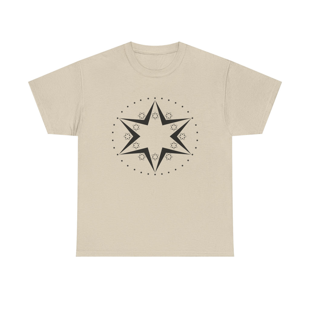 A clean, wearable tee that carries a subtle celestial vibe. The graphic is a sharp, six-point star with layered negative-space shading and rings of smaller stars—minimalist but striking. The shirt feels light and familiar: a classic crew neck and relaxed cut that slips into everyday outfits. It’s the kind of piece someone reaches for when they want to look composed without trying too hard—pair with worn jeans, an overshirt, or a casual jacket. The monochrome design works as a quiet statement for nights out, coffee runs, or low-key gatherings.